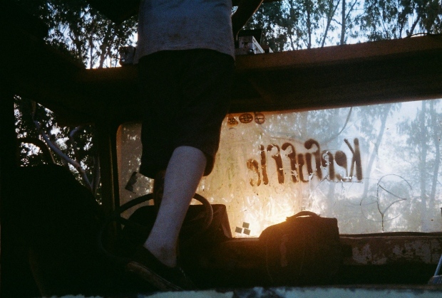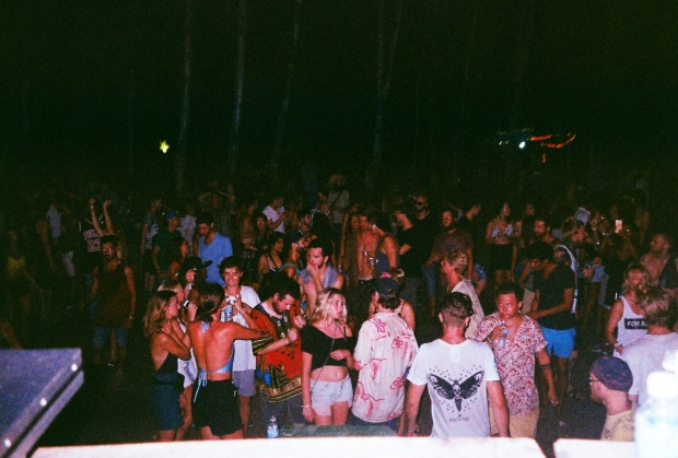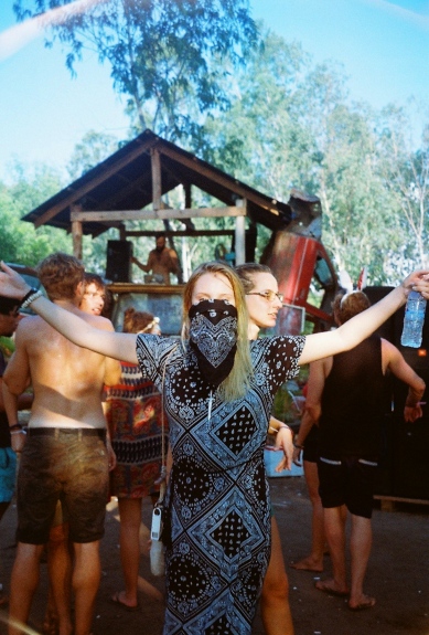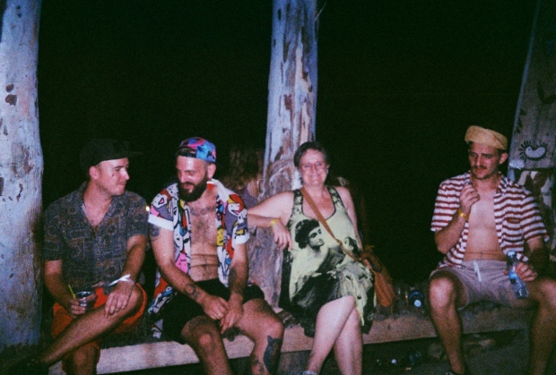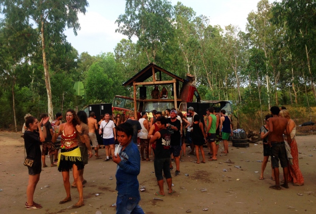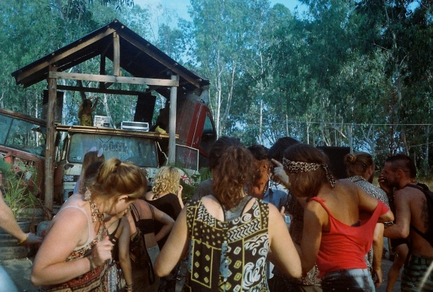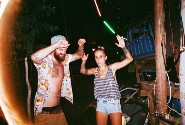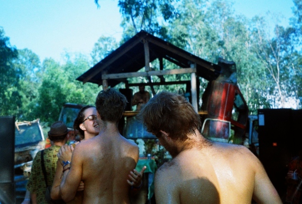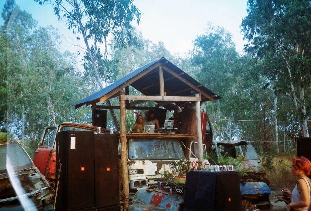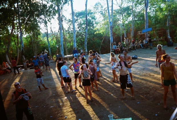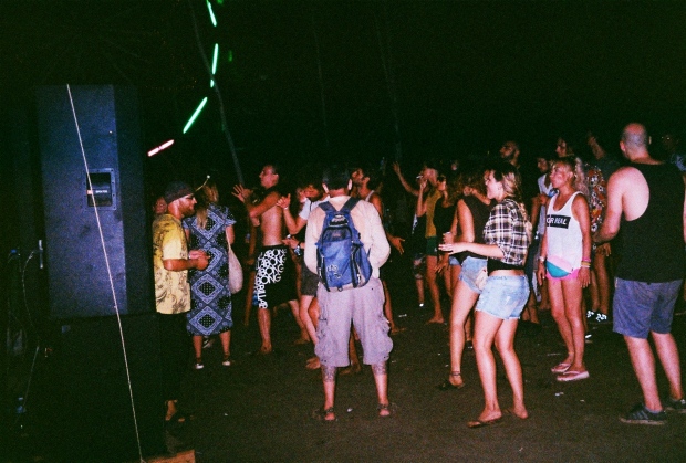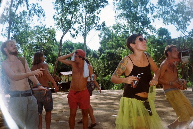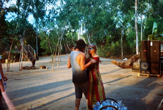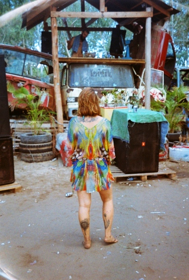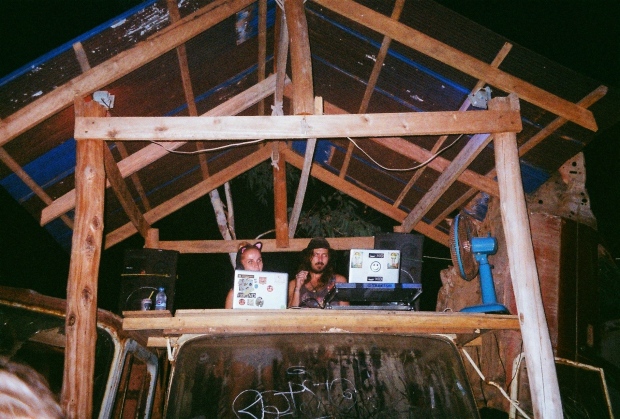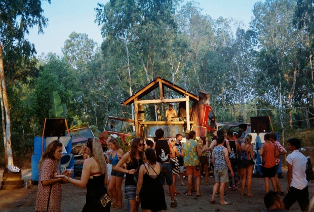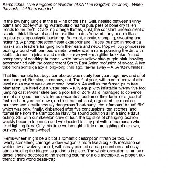 In the low lying jungle at the fall-line of the Thai Gulf, nestled between skinny palms and dopey-mulling Waterbuffalo mama puts piles of bone dry fallen fronds to the torch. Crackling orange flames, dust, the constant undercurrent of cicadas thick billows of acrid smoke illuminates frenzied party people like a tropical post apocalyptic backdrop. Barefoot, mostly, stomping, sweating and hollering. A phosphorescent fiesta extraordinaire. Faces’ painted in neo-tribal masks with feathers hanging from their ears and neck, Pippy-Hippy princesses pixi’ing around with bamboo wands, weekend shamans pounding the dirt with staffs adorned in jetsam and detritus – everywhere a glitter bukkake. A mad cacophony of seething humans, white-brown-yellow-blue-purple-pink, howling accompanied with the omnipresent South East Asian profusion of sweat. A lost tribe from some galaxy a long-long time ago, far-far away – AKA ‘Kerfuffalites’.