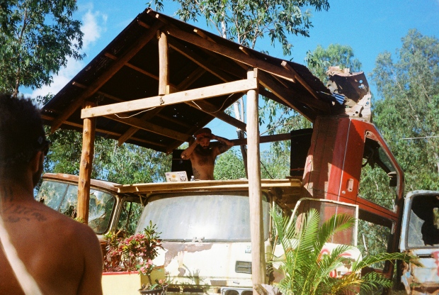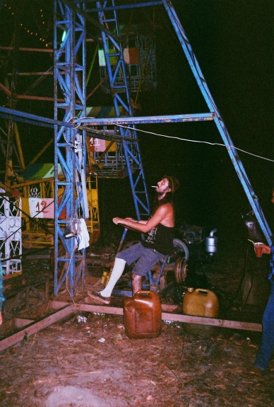 ‘Ferris-wheel’ might be a bit of a romantic description if truth be told. Our twenty something carriage widow-wagon is more like a big-kids mechano set welded by a twelve year old, with spray painted carriage numbers and occy-straps holding the hinged cage doors in place. The whole operation is run by a diesel engine doctored to the steering column of a old motorbike. A proper, authentic, third world death-trap.
