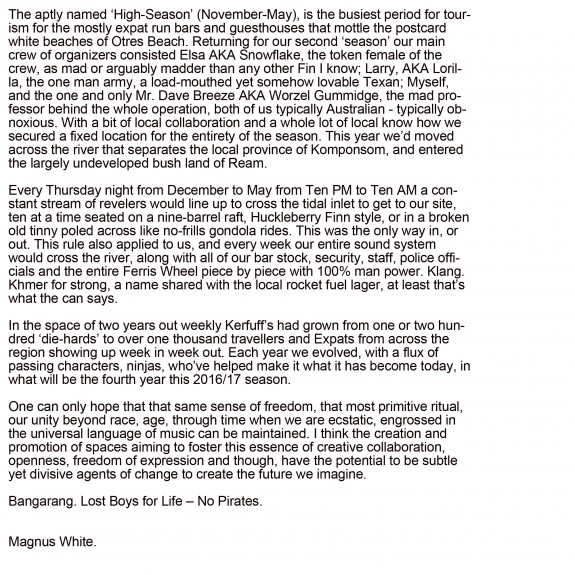 The aptly named ‘High-Season’ (November-May), is the busiest period for tourism for the mostly expat run bars and guesthouses that mottle the postcard white beaches of Otres Beach. Returning for our second ‘season’ our main crew of organizers consisted Elsa AKA Snowflake, the token female of the crew, as mad or arguably madder than any other Fin I know; Larry, AKA Lorilla, the one man army, a load-mouthed yet somehow lovable Texan; Myself, and the one and only Mr. Dave Breeze AKA Worzel Gummidge, the mad professor behind the whole operation, both of us typically Australian - typically obnoxious. With a bit of local collaboration and a whole lot of local know how we secured a fixed location for the entirety of the season.